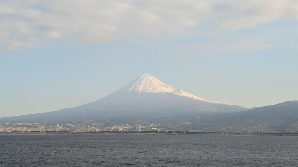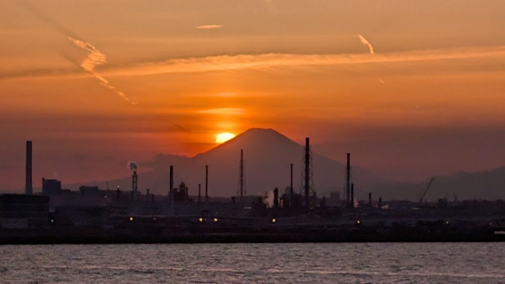出航直後、船から見た夕日と富士山の美しいことといったら!!